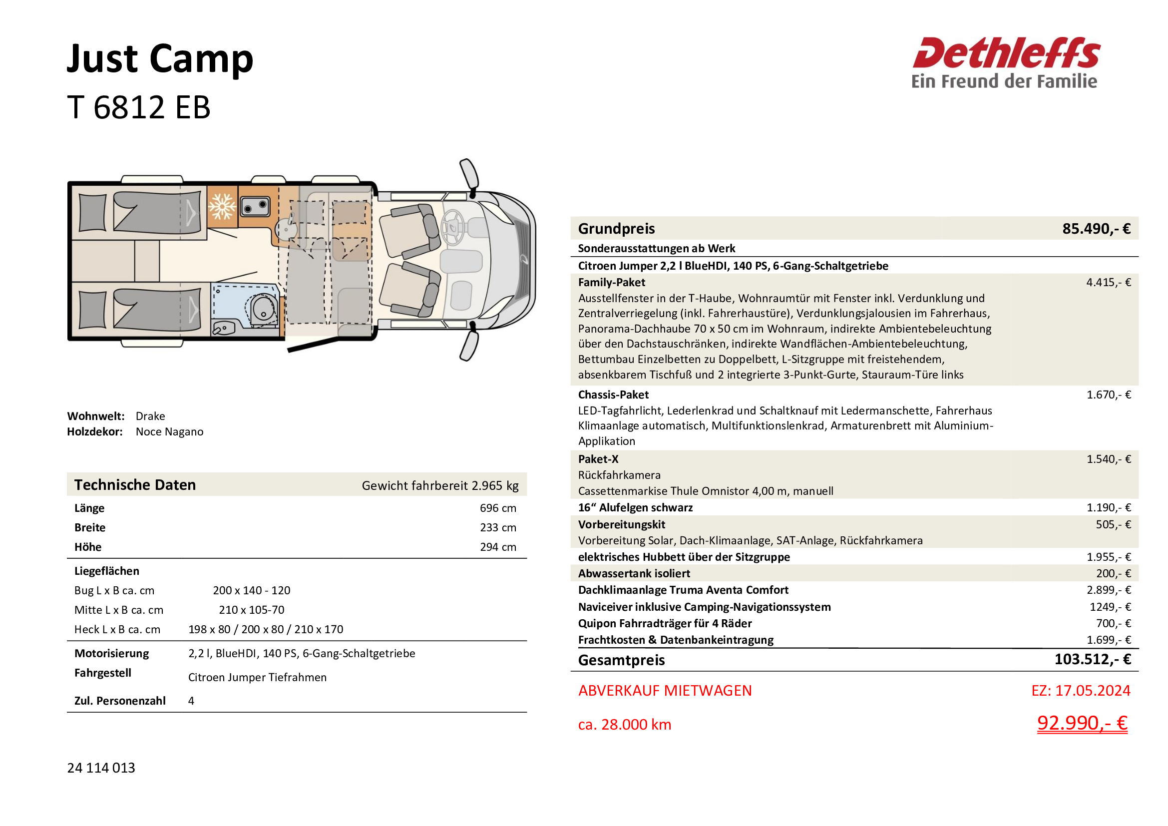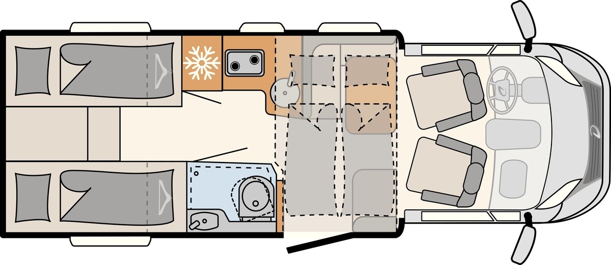 Ausstellfenster in der T-Haube, Wohnraumtür mit Fenster inkl. Verdunklung und Zentralverriegelung (inkl. Fahrerhaustüre), Verdunklungsjalousien im Fahrerhaus, Panorama-Dachhaube 70 x 50 cm im Wohnraum, indirekte Ambientebeleuchtung über den Dachstauschränken, indirekte Wandflächen-Ambientebeleuchtung, Bettumbau Einzelbetten zu Doppelbett, L-Sitzgruppe mit freistehendem, absenkbarem Tischfuß und 2 integrierte 3-Punkt-Gurte, Stauraum-Türe links - Chassis-Paket